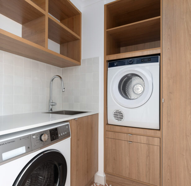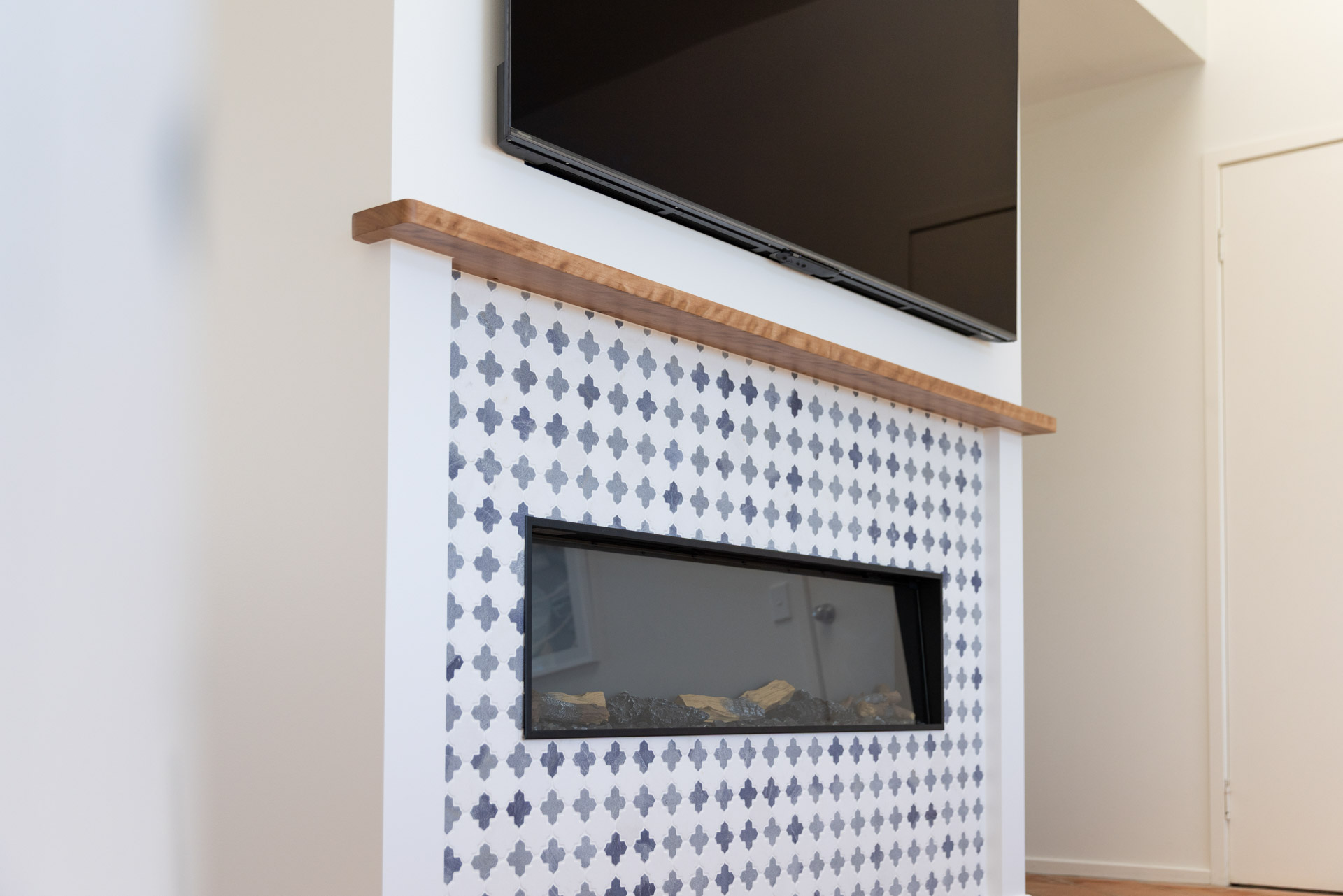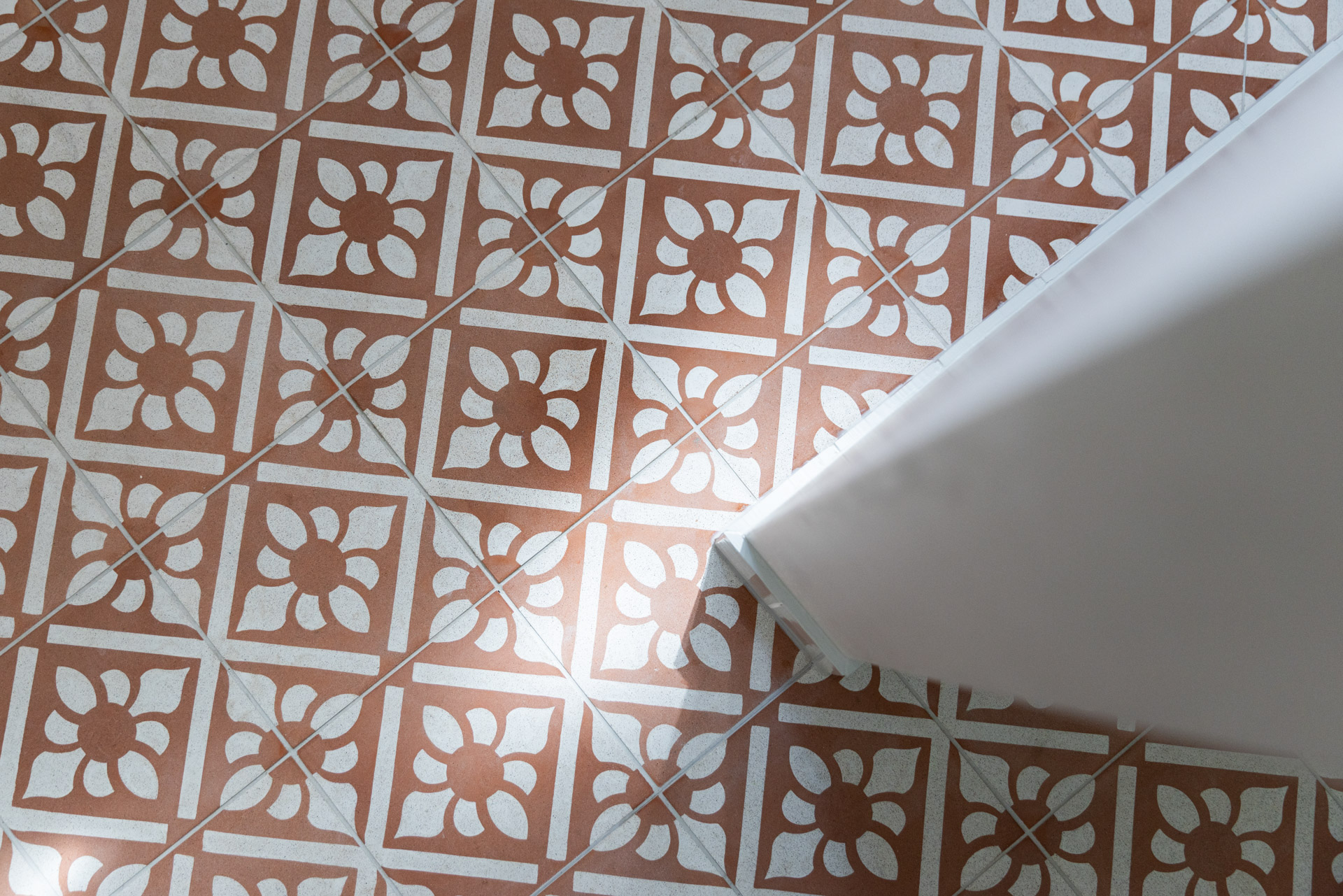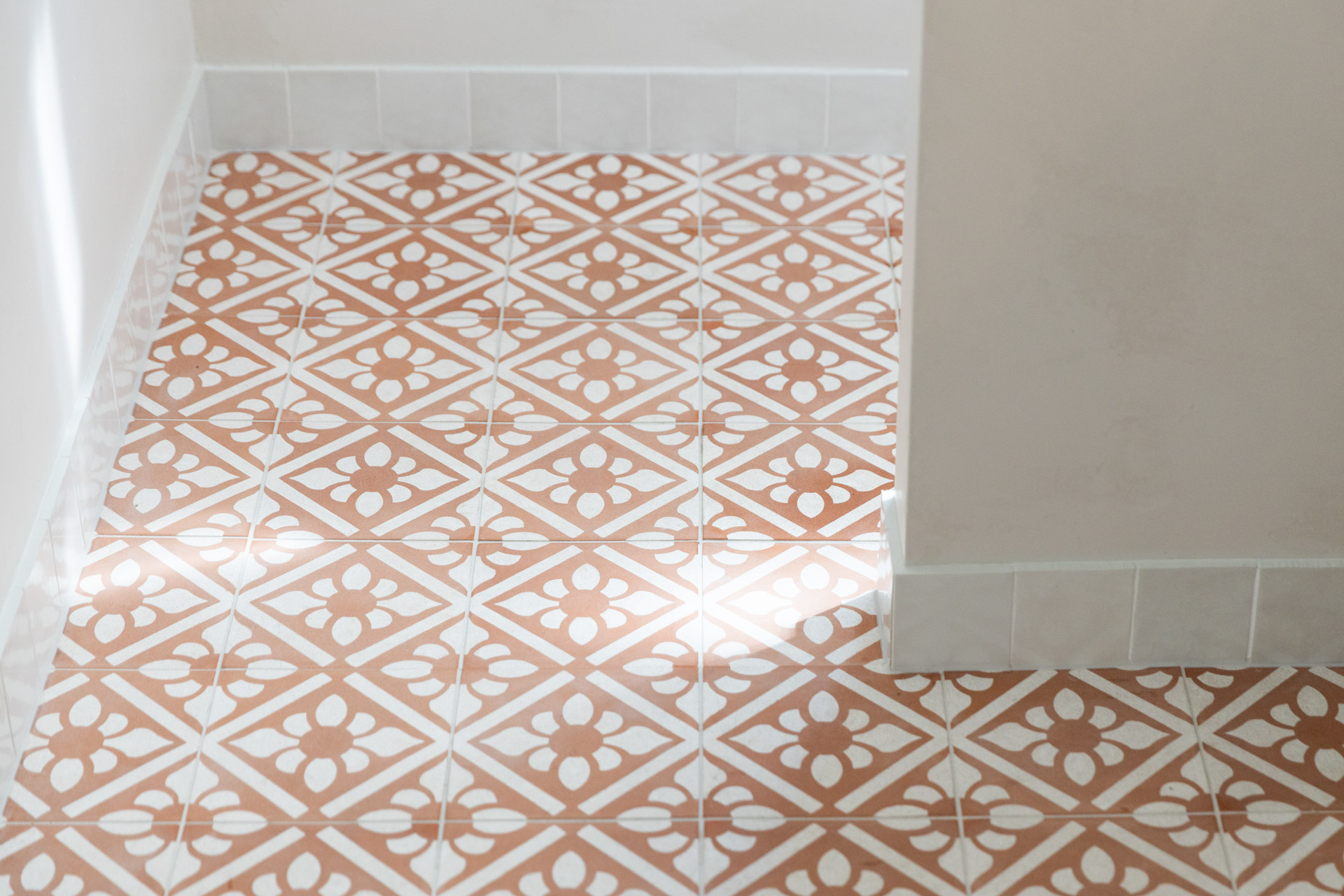 The floors were reimagined with handmade encaustic tiles, bringing pattern, texture, and a sense of heritage to the foundation of the room. To complement the flooring, the walls were clad in a lively mix of burnt orange and crisp white zellige tiles. Their glossy, irregular surfaces reflect light beautifully and create a playful contrast, infusing the space with warmth and energy.