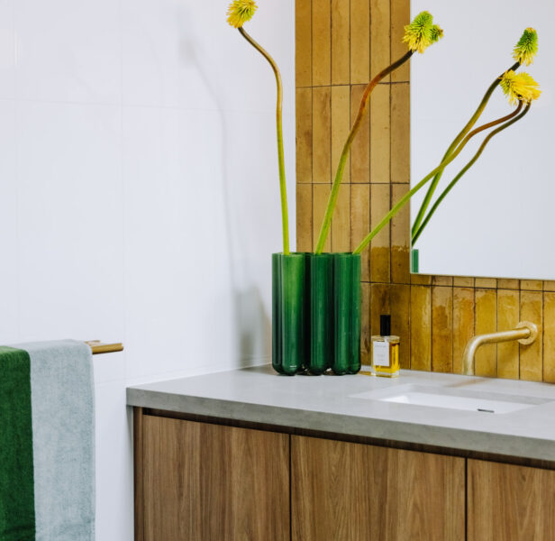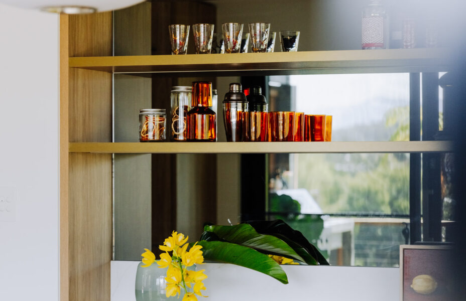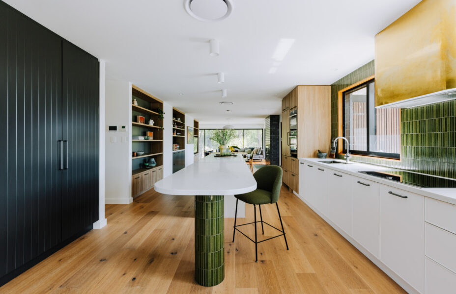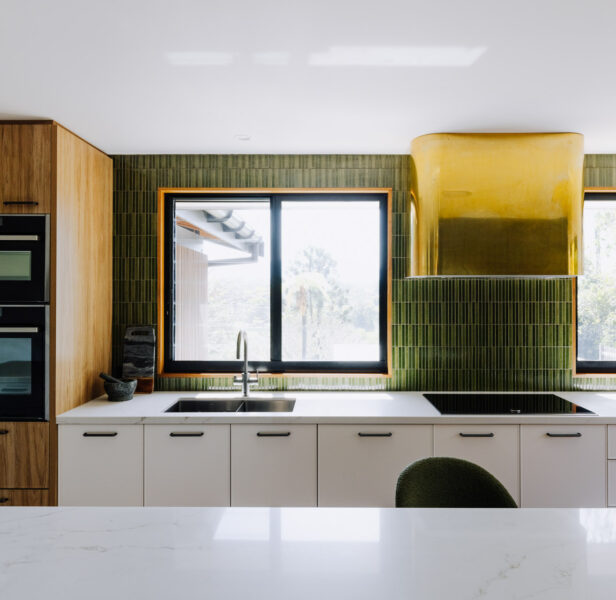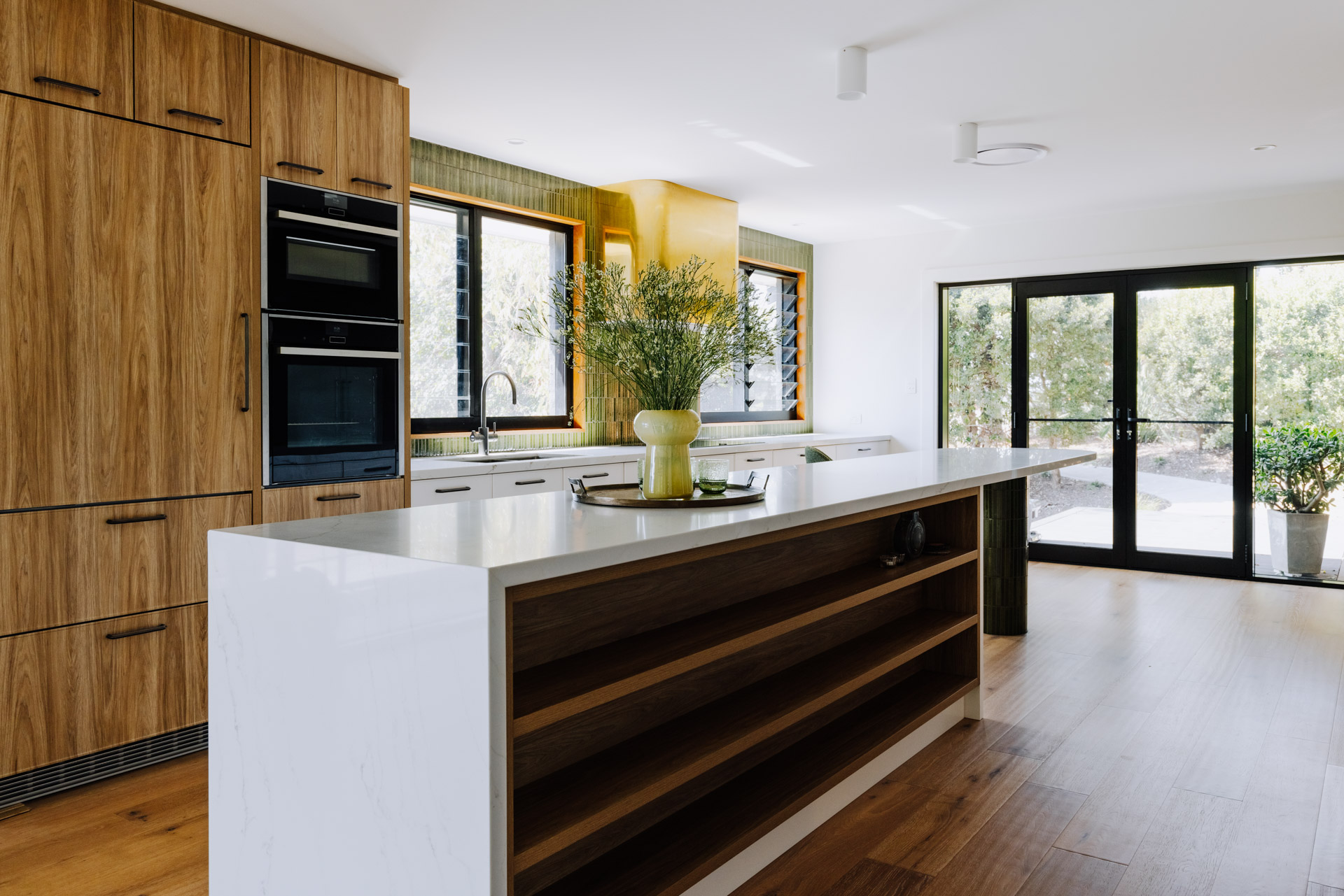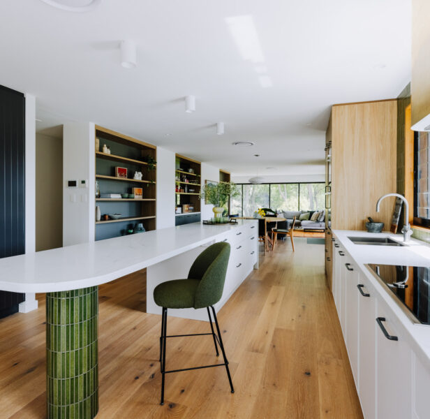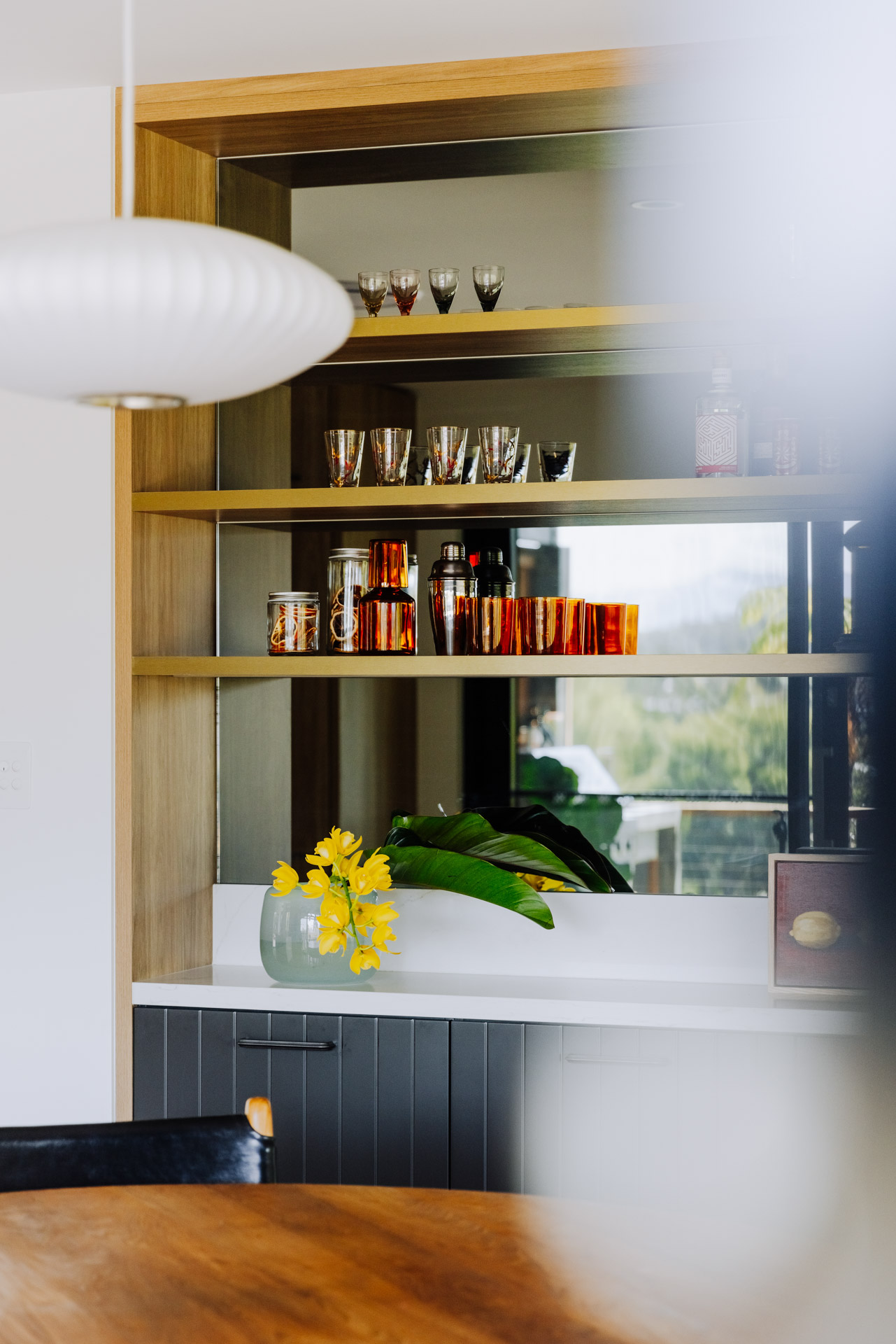 Once we opened up the kitchen to the living dining, we then resolved what was a long, narrow space with functional and defined zones with focal points such as a bar, media and fireplace zone all equally balanced with the view. A warm, natural and organic palette of timber, hand glazed tiles and colour depth are offset by quality detailed finishes in hardware, lighting and tapware.