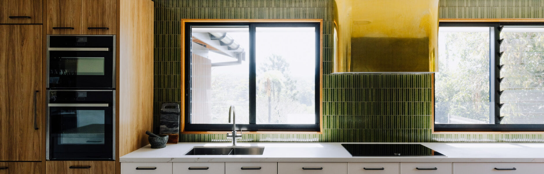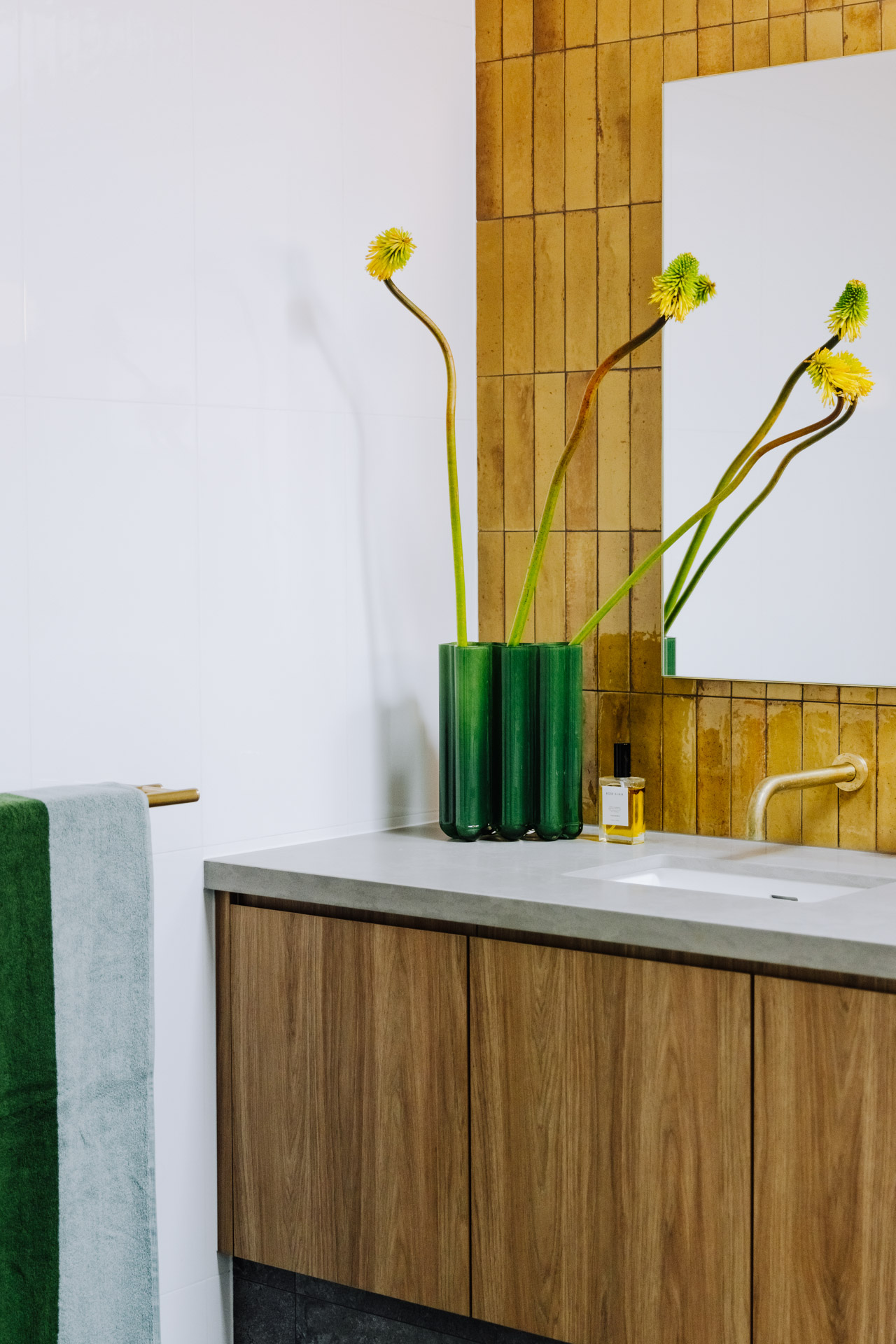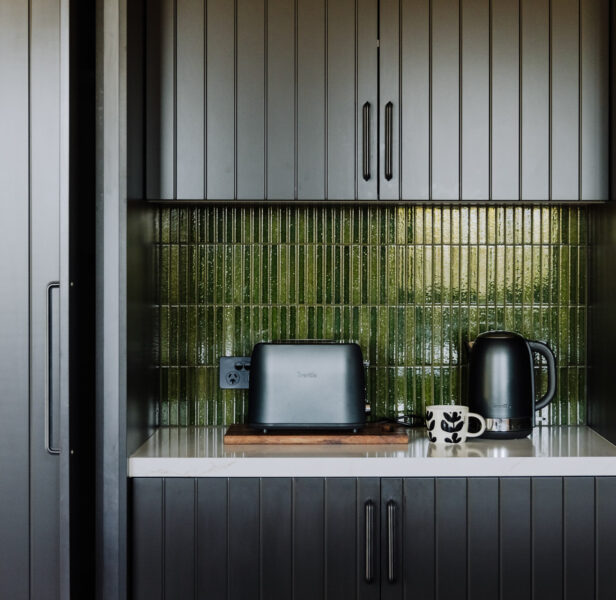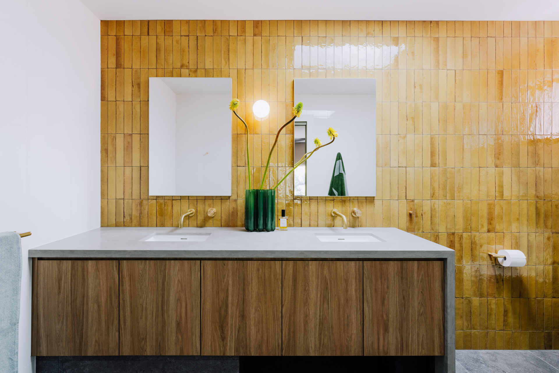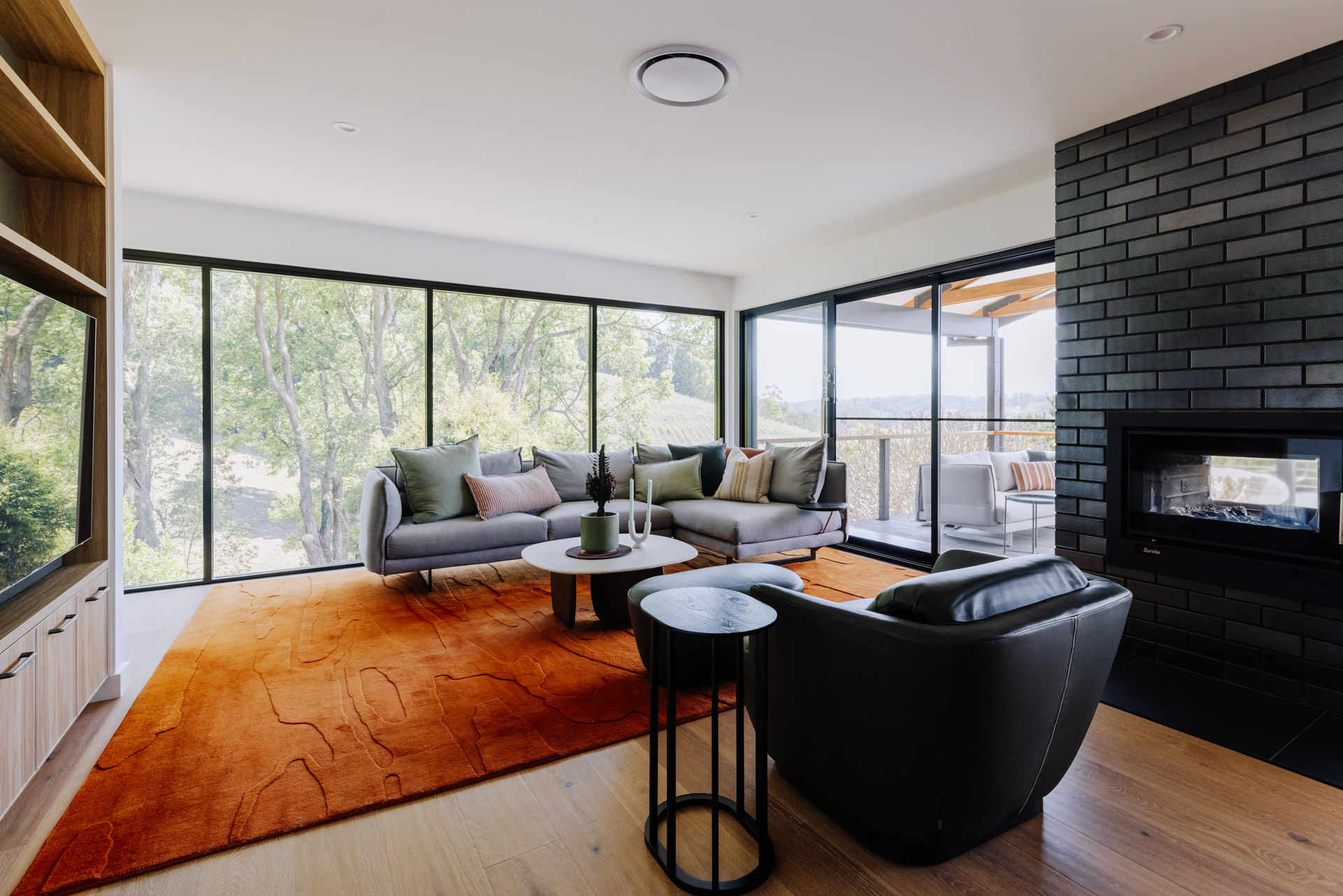 Once we opened up the kitchen to the living dining, we then resolved what was a long, narrow space with functional and defined zones with focal points such as a bar, media and fireplace zone all equally balanced with the view. A warm, natural and organic palette of timber, hand glazed tiles and colour depth are offset by quality detailed finishes in hardware, lighting and tapware.