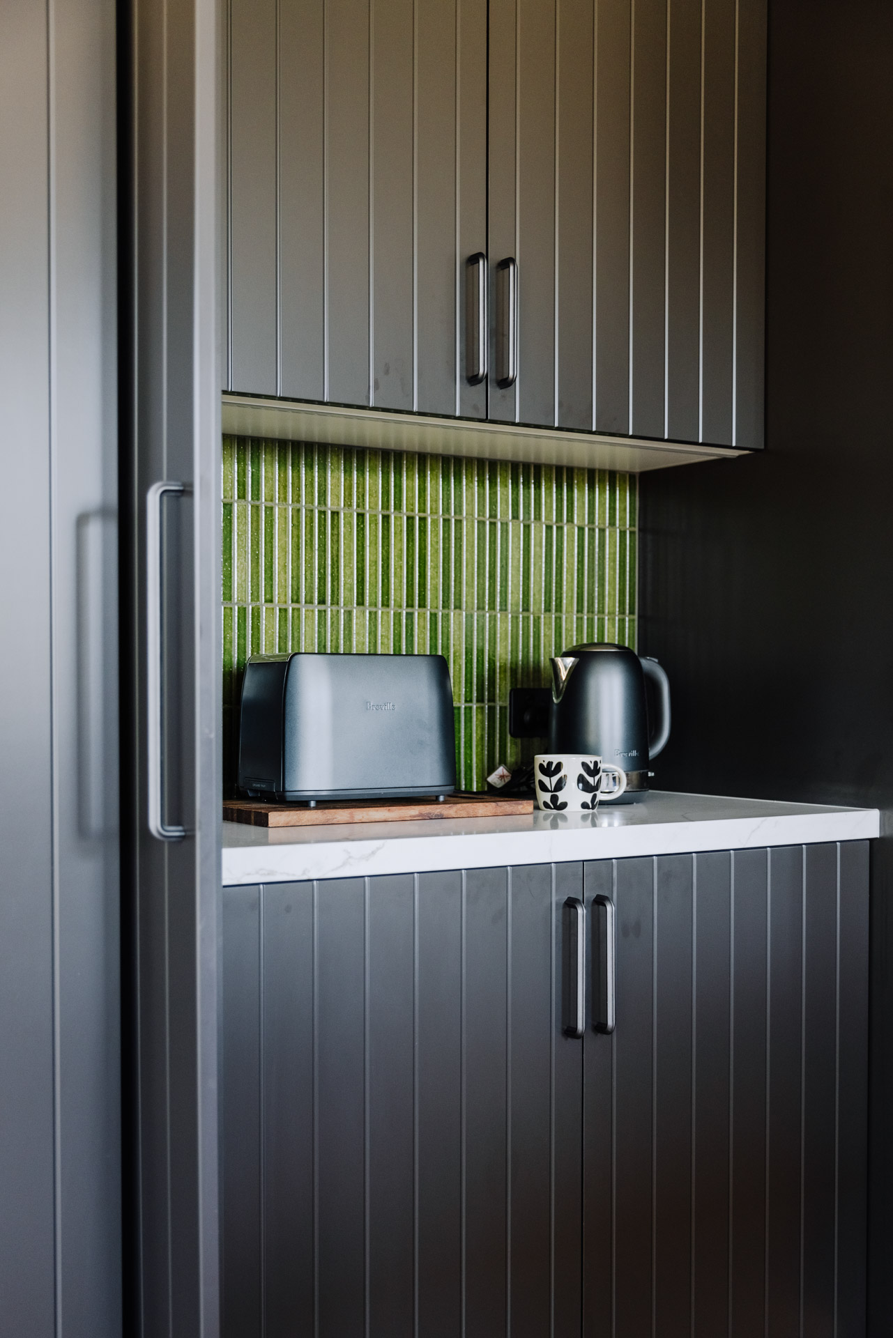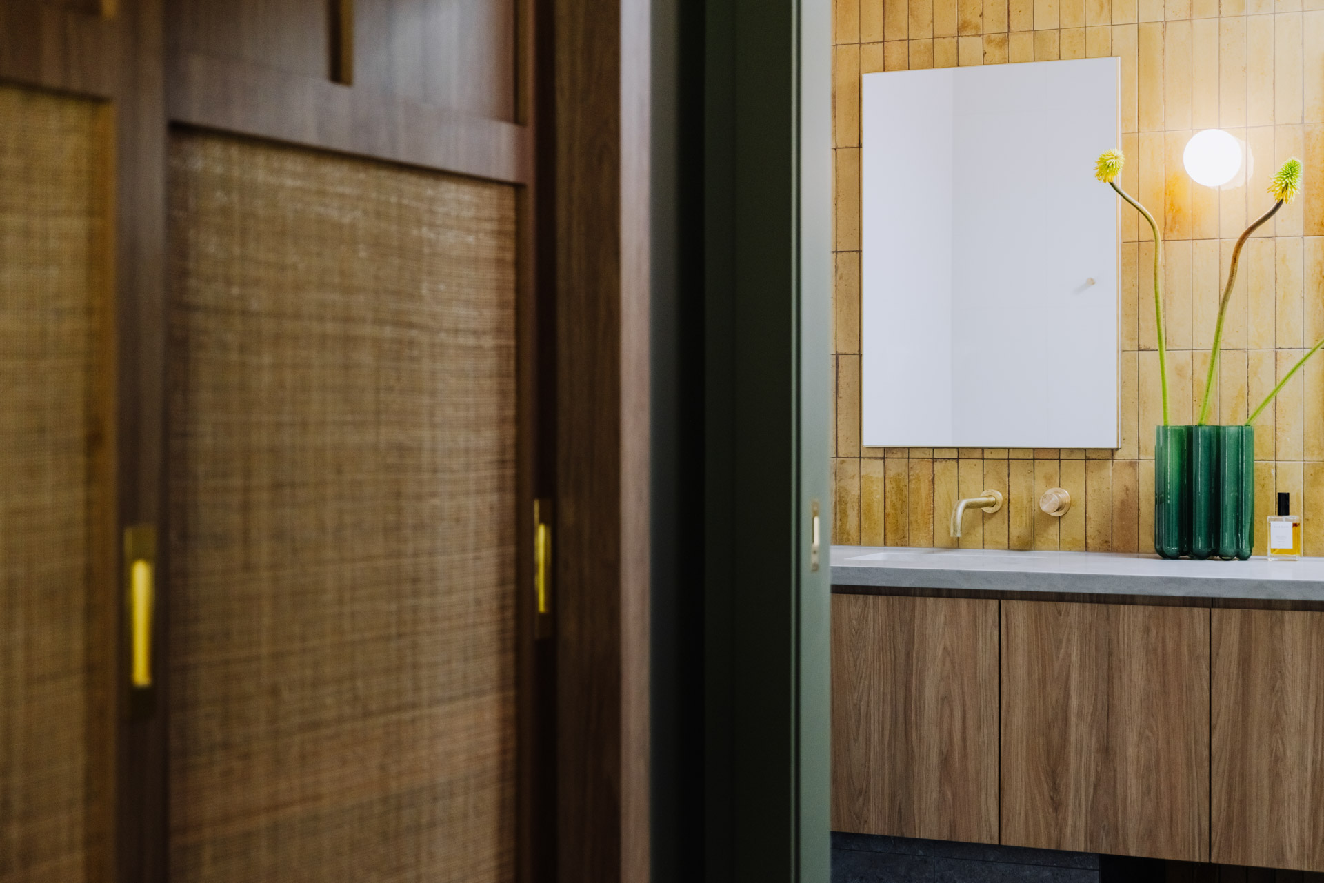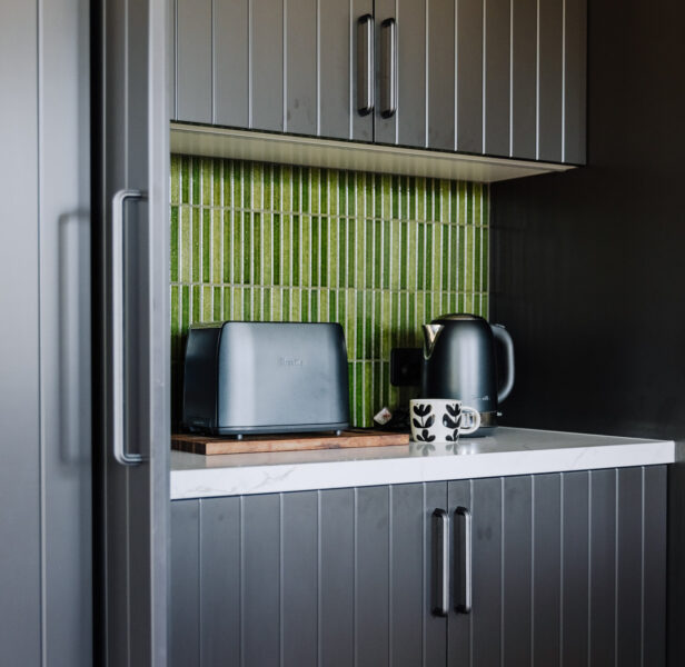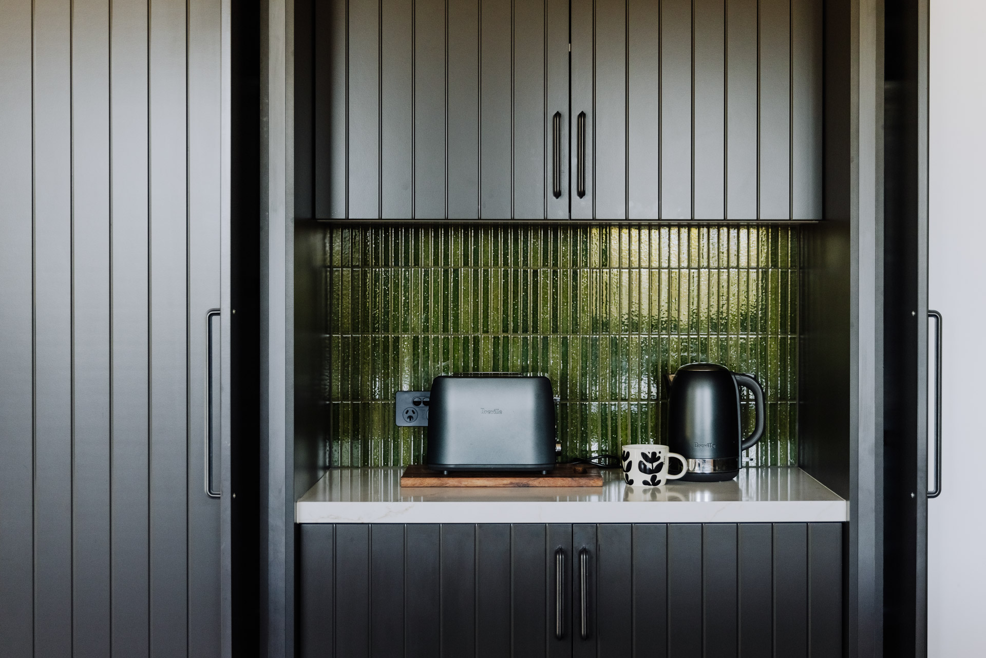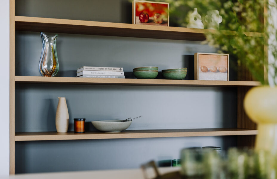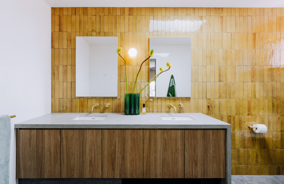 Once we opened up the kitchen to the living dining, we then resolved what was a long, narrow space with functional and defined zones with focal points such as a bar, media and fireplace zone all equally balanced with the view. A warm, natural and organic palette of timber, hand glazed tiles and colour depth are offset by quality detailed finishes in hardware, lighting and tapware.